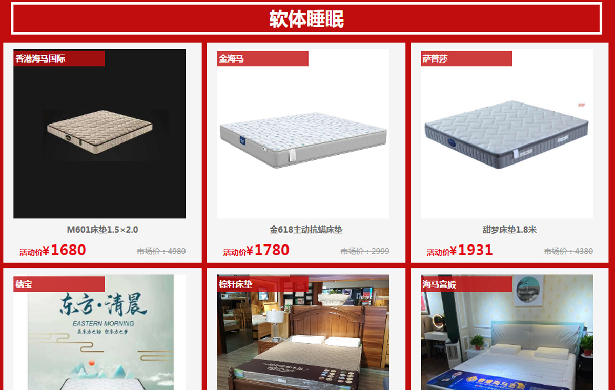 软体睡眠:舒达、雅兰、美得丽、斯林百兰、棕轩、金海马、海马莱思、大自然、穗宝、尊堡、萨普莎、菲尔、海马寝具、美梦家居、慕思3D