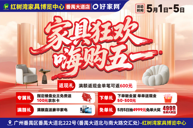 活动地址:广州市黄埔区中山大道东280号(茅岗立交旁,地铁5/13号线鱼珠站C出口)-红树湾家具博览中心