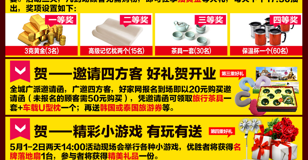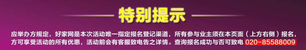 特别提示:应举办方规定,好家网是本次活动唯一指定报名登记渠道,所有参与业主须在本页面(上方右侧)报名,登记成功方可享受活动的所有优惠环节,活动前会有客服致电告之详情。如对报名成功与否有疑问,可致电020-85588009查询→