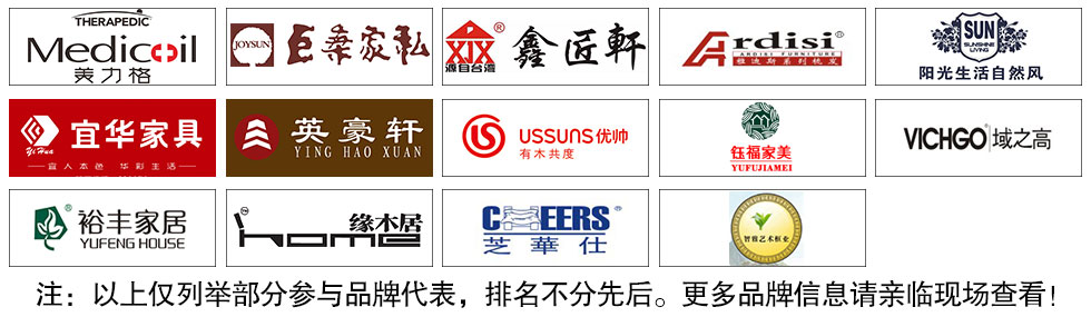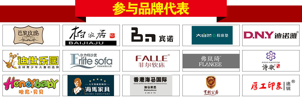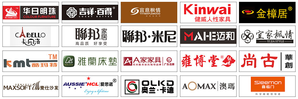 板式:澳玛、迪诺雅、时尚美居、迈和、简道家、好易达、欧瑞·摩卡、健威 现代客厅:域之高、酷玛特、尔力特、双蜻蜓、匠明、英豪轩、芝华仕、金海马、联邦米尼、左右、诗歌、名古天尼、宾诺、麦仕、锐格、通典、弗岚琦、雅阁瑞斯、金丽丝、杜邦美居、美力格、富格斯、雅迪斯、阳光生活、左梵仕、健威 睡眠:慕思凯奇、大自然、穗宝、菲尔、喜临门、雅兰、慕思3D、海马、爱思诺 实木:鑫匠轩、裕丰、名府工匠、小康人家、金樟居、家福莱、钰福家美、韵木居、柏家居、银狐、优帅、梦柏、宜华、厚工印象、宜家枫情、宜意枫情、华逸轩、缘木居、吉祥百得、鲁派、联邦、尚古华创、美闲、美临门、A家·金爵士、A家实木、天籁、木拓、迪诺雅·金柚木 欧式/韩式:卡贝洛、亨利公爵、茉莉花香、摩高、巴黎玫瑰、迪诺雅·北美印象 儿童:帅可、七彩空间、迪世乐园、哈尼贝贝 红木:大森林、雍博堂、儒艺轩、水一坊、和悦古典、汇演、盛泰、华夏一品、金森、德宝红木、福年年 其它:振轩装饰、堂中宝、智雅画廊、正妍刺绣、雅兰地毯、金富来鞋柜