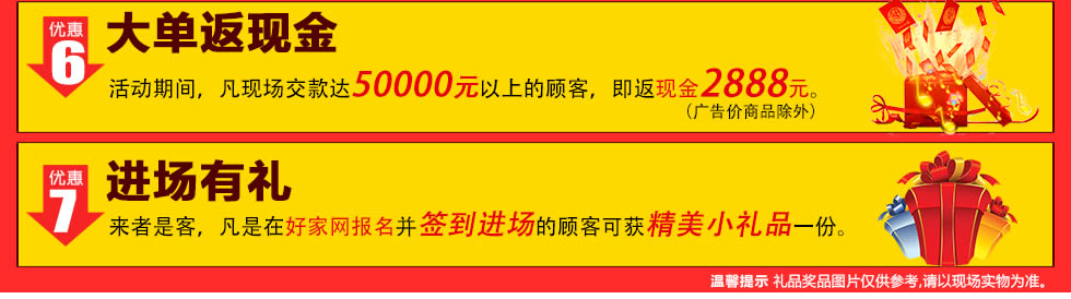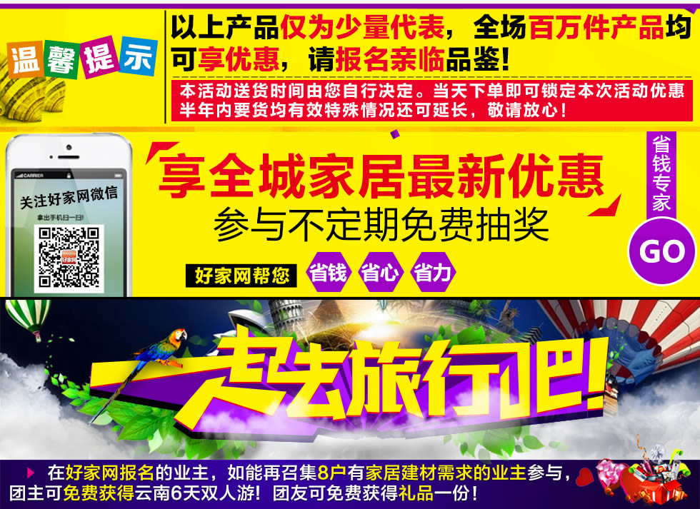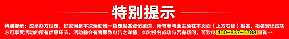 特别提示:应举办方规定,好家网是本次活动唯一指定报名登记渠道,所有参与业主须在本页面(上方右侧)报名,报名登记成功方可享受活动的所有优惠环节,活动前会有客服致电告之详情。如对报名成功与否有疑问,可致电400-837-6788查询→